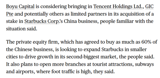 一个月前,星巴克咖啡正式宣布博裕收购星巴克中国60%股权。